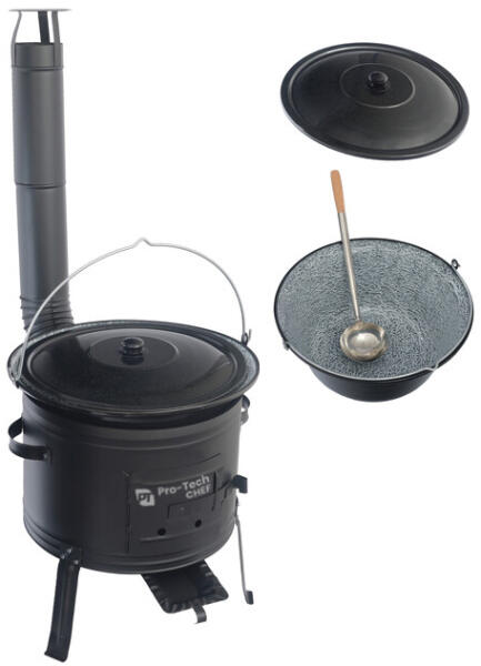 Zománcozott gulyáskészlet 22l Pro-Tech CHEF A zománcozott gulyásfőző készlet 22 literes Pro-Tech CHEF egy praktikus szett mindenki számára, aki szívesen főz a szabadban. Ez a készlet tartalmazza az összes szükséges eszközt különböző hagyományos ételek, például gulyás, káposztás ételek vagy disznótoros fogások elkészítéséhez. A fő eleme egy zománcozott bogrács, amely 22 literes űrtartalommal rendelkezik, és elegendő helyet biztosít nagy adag ételek elkészítéséhez több ember számára. A készlet tartalmaz továbbá egy 42 x 51 cm-es üstházat, amely nyílt tűzön való használatra alkalmas. Az üstház stabil és tartós kialakítású, ami biztosítja a biztonságos és kényelmes főzést. Az üstházhoz tartozik egy könyökcső és egy füstcső is, amelyek hatékony füstelvezetést tesznek lehetővé, javítva a főzési élményt. A készletben található egy fedő is. A fedő úgy van kialakítva, hogy tökéletesen illeszkedjen a zománcozott bográcshoz, így segít megtartani a hőt és biztosítja az egyenletes főzést. Az ételek tálalásához és keveréséhez a készlet tartalmaz egy 250 ml-es, 39 cm hosszú rozsdamentes acél merőkanalat is. Ez a zománcozott bogrács készlet  Pro-Tech CHEF ideális mindenki számára, aki szívesen főz a friss levegőn, és szeretné, ha minden szükséges eszköz egy praktikus szettben állna rendelkezésére. Segítségével könnyedén és kényelmesen elkészíthetők finom ételek, amelyek minden hagyományos konyha kedvelőjét elvarázsolják.   Technikai paraméterek:Üstház méretei (átm x ma): 42 x 51 cmBogrács űrtartalma: 22 lMerőkanál űrtartalma: 250 mlMerőkanál hossza 39 cmCsomagolás tartalma: Bogrács 42 cmKönyökFüstcsőZománcozott bogrács gulyás 22lFedő zománcozott / rozsdamentes acél (változattól függően)Rozsdamentes acél merőkanál 250 ml